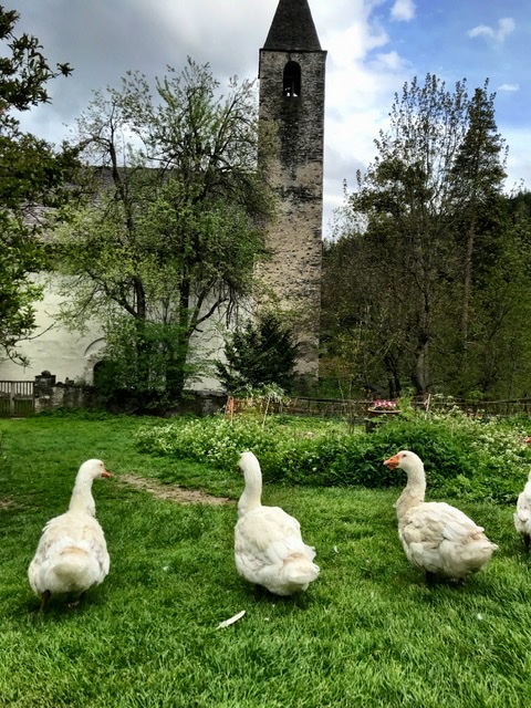 Then, soon after Tiefencastel, we visited the old church of St. Peter in Mistail dating back to 800 AD. Just reaching the church is a mystical experience in itself. From the main road, a wide gravel trail descends through the woods for about 500m until the small white church appears, isolated, through the vegetation. A farmer and its dwelling stand as the sole guardians to this religious site. Well, save for some geese that stood put in front of the church, protecting its entrance and did not want to let me pass……..