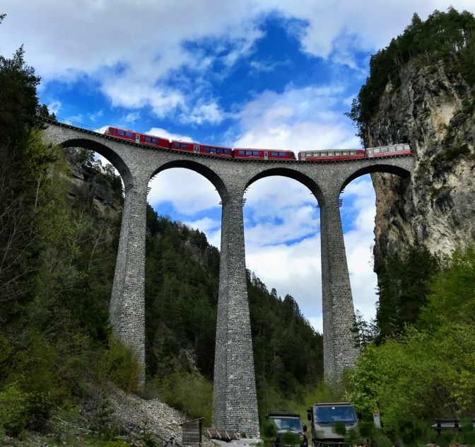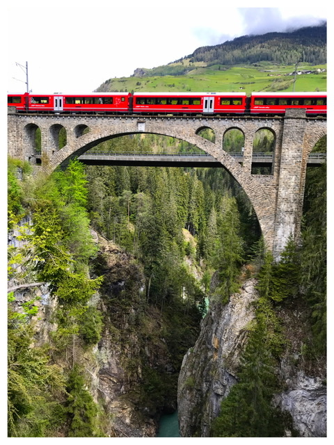 From this location at the foot of the elegant arches, we stood admiring the 65-meter-tall soaring columns of the UNESCO viaduct (built in 1901), until the picturesque red train showed its head out of the tunnel. This viaduct is also the largest on the Rhaetian line.