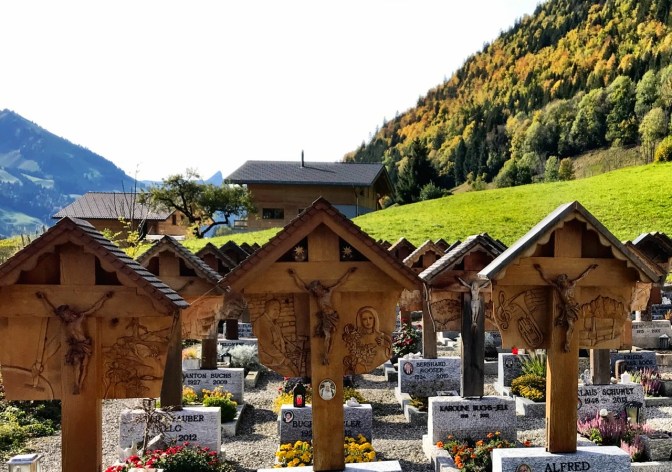 But midway is the small village of Jaun (1,010m) (Section divide 59:02/03) nestled between mountains. Here, the new church’s cemetery has peculiar tombstones decorated in carved wood depicting the life of the deceased person.