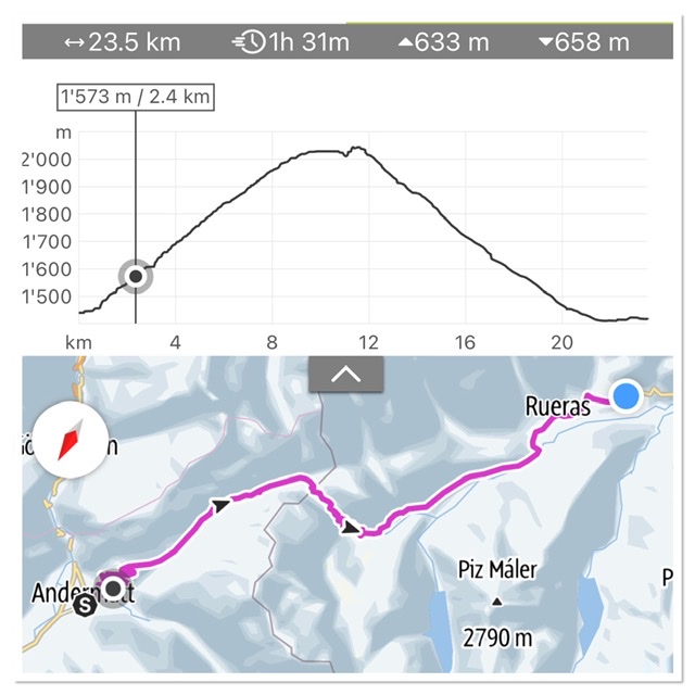 Section 2:01 actually ends in Disentis (1,100). Tomorrow I will complete the additional 8km of descent towards this monastery village. And then onto Section 2:02 until Chur.