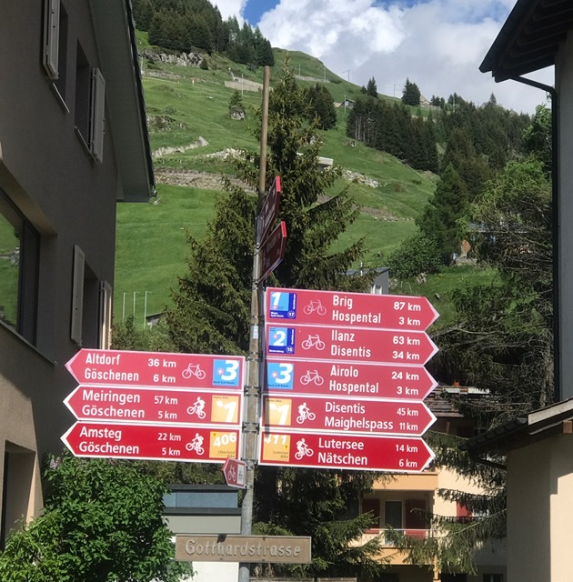 The village is located in a high valley nestled between the Alps. It sits at the crossroads of four National Bike Routes (#1, #2, #3, and MTB-1), surrounded by three major Alpine passes: the Gotthard (south), the Furka (west) and the Oberalp (east); in fact, to avoid any climbing, the only downhill direction is straight nord towards Lake Lucerne.