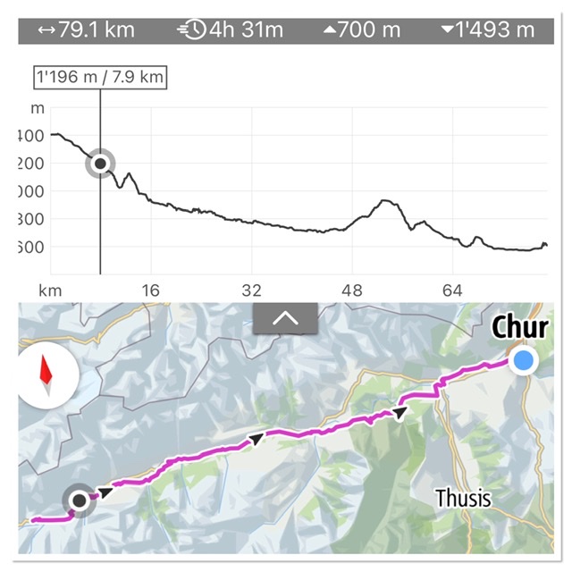 This is a long ride with some important elevation. Although I had to catch up with the extra 8 km to Disentis left from the day before, these were irrelevant since they were all downhill.