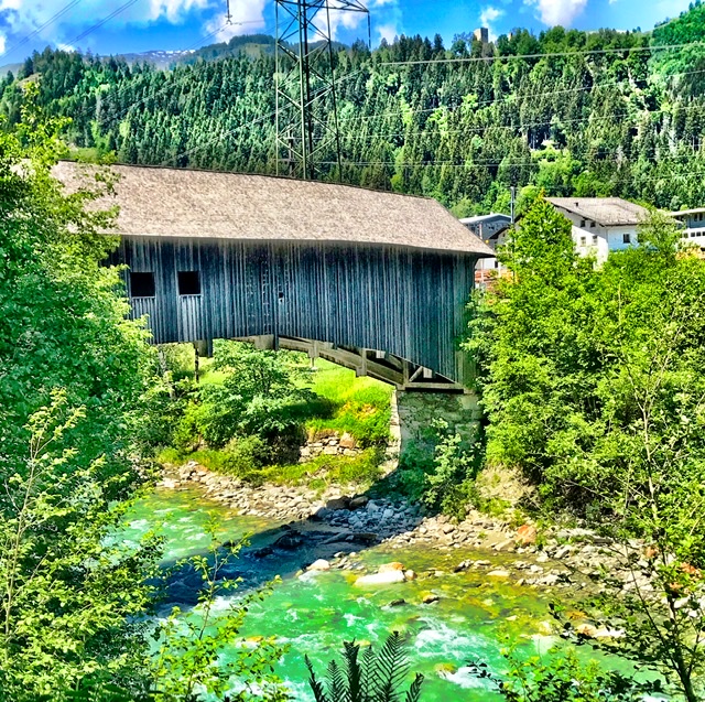 After a thrilling descent through many hairpin bends, the road crosses Versamer Gorge. Here I parked the bike and walked on an 1897 steel bridge overlooking the rumbling stream 70m below. But the photos do not capture the dramatic plunge so I skipped them.