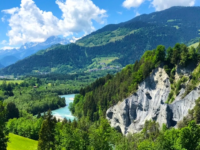 Continuing westwards the road climbs about 250m to give impressive views of the Rhine Gorge / Rheinschlucht / Ruinaulta (flims.com/en/experience-resort/nature/rhine-gorge). The magnificent landscape of the canyon with its incredibly tall grey rocky walls and upper Rhine river below has suggested the appellation of «Grand Canyon of Switzerland»