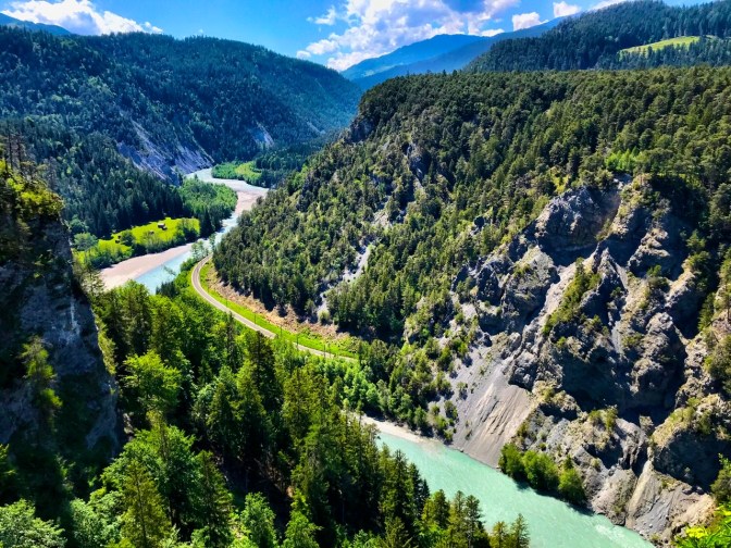 Then the road reconnects with the Rhine Gorge via an extremely picturesque route, passing next to straight rocky walls, natural tunnels and even a split rock, all the while with vertiginous views of the Rhine below.