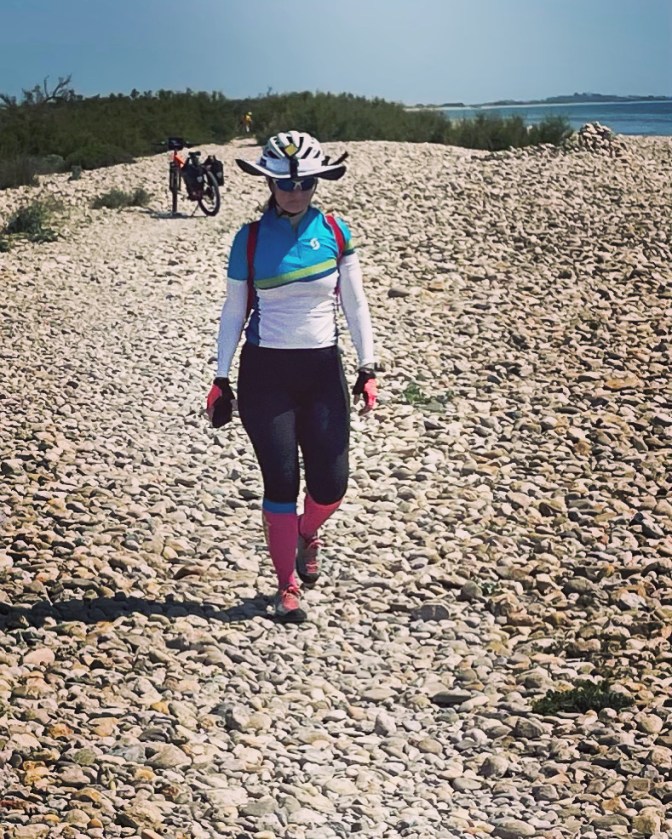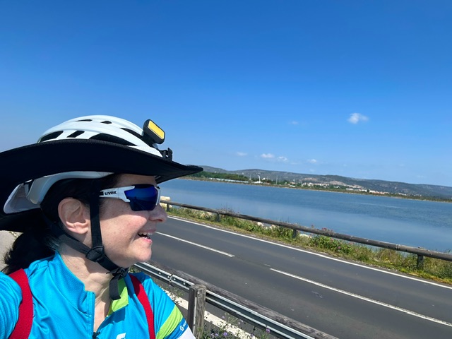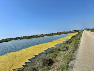Continuing along the route we are enveloped by salty sea breeze and Mediterranean vegetation, until we finally reach a series of large ponds on the coast. The temperature has become hotter by now, even if it is only May. I can’t imagine how hot it may be if cycling this route in full summer!
