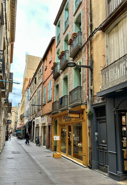 Arrived in Perpignan, we stop at a café for lunch and then roam the historic town: it is very cute and colorful, with narrow winding alleys and quaint little shops reminding a little of old Nice or Cannes but with brighter colors from the Spanish influence.