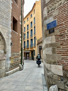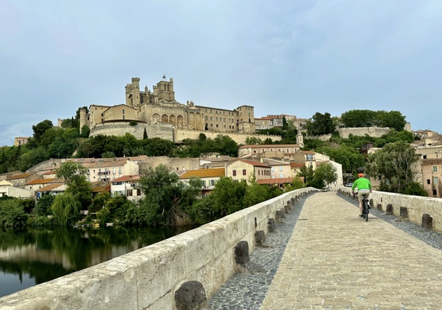 Our B&B is a farmhouse below the perched town of Beziers. Unloaded our bags, washed our bike clothes, we change and bike uphill to dine in the old town.