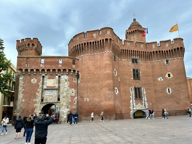 1) Palais des Rois de Majorque (Palace of the Kings of Mallorca) of the 13th century. It is a large fortified castle with massive walls but from the outside one sees only red-brick walls, like a prison.