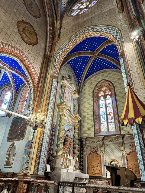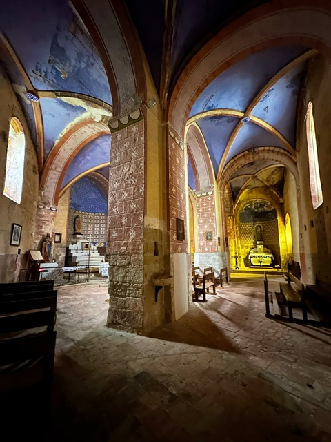 Its main attraction, just outside the town, is the Gothic Basilica of Notre-Dame de Marceille, a pilgrim stop on the way to Santiago de Compostela. This is an incredibly richly decorated church, with bright blue colors. My jaw dropped as I entered the basilica: I have never seen something so colorful especially in a church.