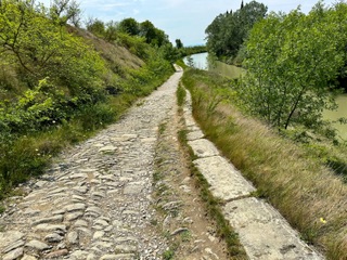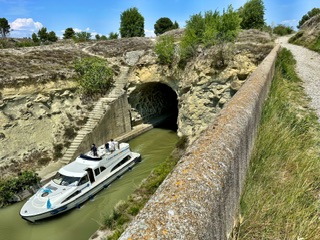 Rejoining the Canal, we discover the “tunnel of Malpas”, excavated in 1679, while a small boat inches out of it. This is Europe’s first navigable tunnel, designed again by the engineer Pierre-Paul Riquet. The bike path next to it is of roughly cut stones and old.