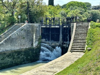 At the end of the day we reach the “9 Locks of Fonserannes”, next to Beziers, part of the Unesco World Heritage site of the Canal du Midi. This is another 17th century engineering masterpiece designed to move up and down boats along the multilevel man-made canal (for a total 21 meter water height difference). Like all the tourists, we stop by the locks and wait for the show of opening and closing of locks, the rush of water through them, and the lifting of boats up by the water.