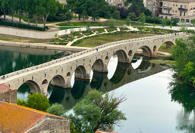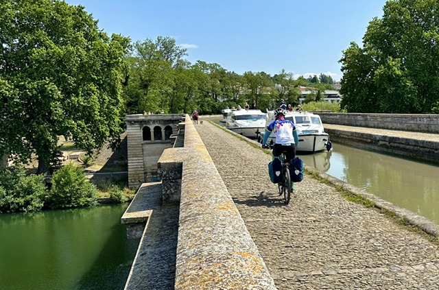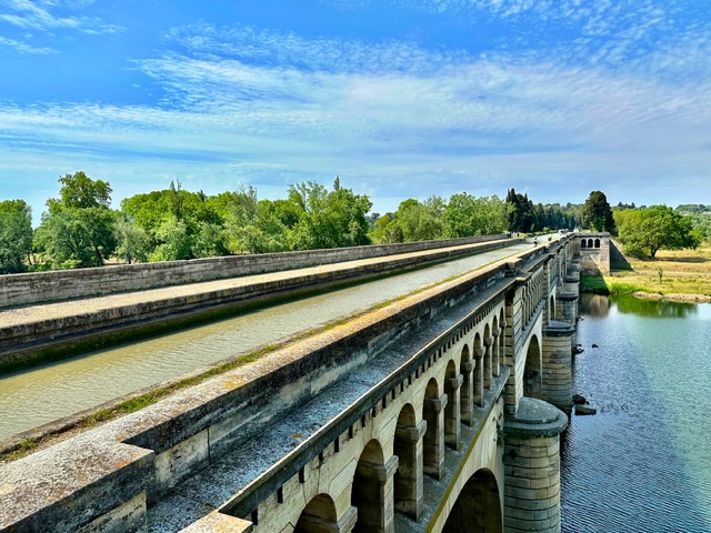 We leave Beziers by crossing an extraordinary Bridge-Canal , built in 1858 to allow boats on the Canal du Midi to continue onto the other side of the river Orb). I’ve never seen such a product of engineering! An absolute marvel. Basically, it is a bridge that, instead of a road, it contains water deep enough for boats to pass through, flanked by sidewalks for pedestrians. Waters above waters! Boats crisscrossing above boats!