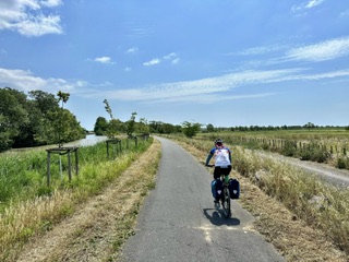 It is a beautiful relaxing ride. The downside of this section (and many others along this Route) is that it is entirely under the sun, with absolutely no shade! But we are all covered up, even with a nice “sombrero” helmet ….