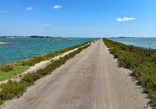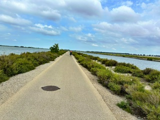 Then, at Le-Grau-Du-Roi we enter another thin strip of land, adapted for bikes, in between a series of ponds.