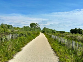 Biking this strip is lovely: we are on a dedicated Voie Verte immersed in low vegetation, and separated by the beach by shrubs and dunes (yeah, actually we cannot see the beach/water even if only meters away).