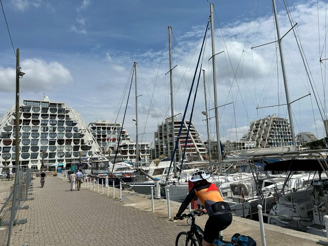 Left Montpellier we rejoin the coast via a quiet Voie Verte until we reach the popular seaside resort of La Grande Motte, with its bizarre pyramidal and triangular buildings.