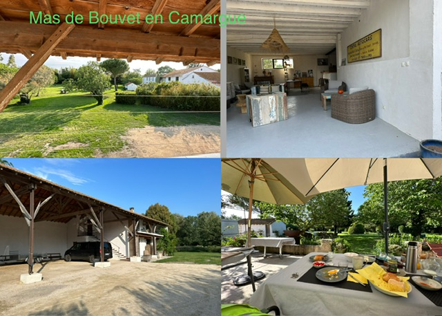 We finally reach our FarmHouse /B&B in Albaron. I want to mention its name, Mas de Bouvet, because this is by far the best lodging of the trip! Enveloped by countryside and marshland, the owner has upgraded an old barn with a couple of comfortable and elegant suites with terraces facing the yard.