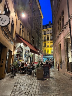 We arrive in downtown Lyon right on time for dinner. It is a beautiful evening and we enjoy walking the streets of Vieux Lyon and savoring some good food.