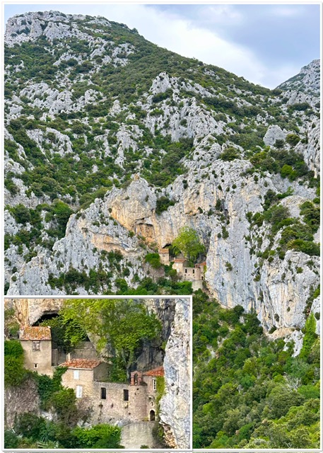 After 10km and 130m elevation we reach what is now known as the Hermitage of St. Antoine de Galamus. It sits at the entrance of the Gorge, hidden on a side of the mountains. To visit the Hermitage, which is signposted by a large parking lot, one has to hike a path in the mountain, leaving bike and luggage behind, and so we skipped it ( https://www.gorgesdegalamus.fr ).