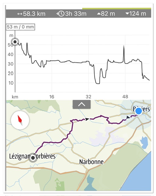 DAY 4 /3rd day biking: first 18min train ride (Carcassonne to Lezignan-Corbieres), followed by bike (Lézignan-Corbières to Beziers, EV8/ Canal du Midi): 59km, +80m gain.