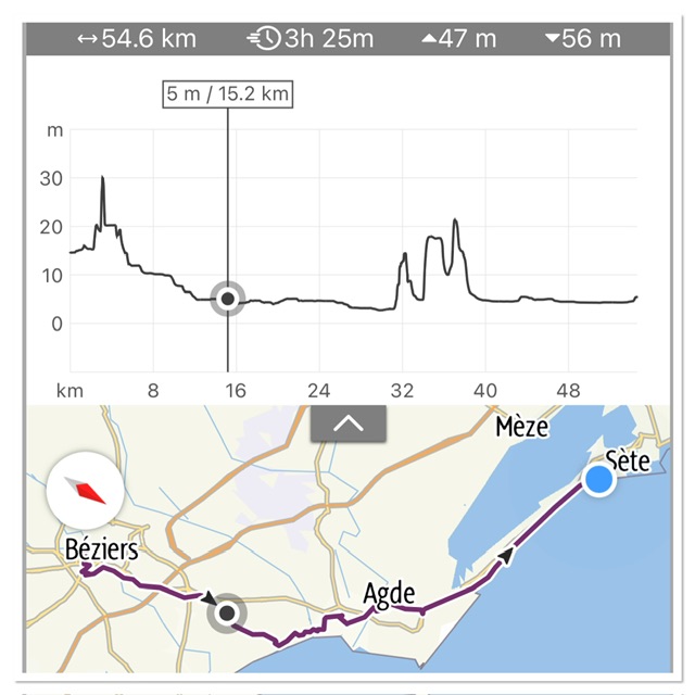 DAY 6 /5th day biking (Sete to Montpellier, EV17/EV8): 49km, +60m gain