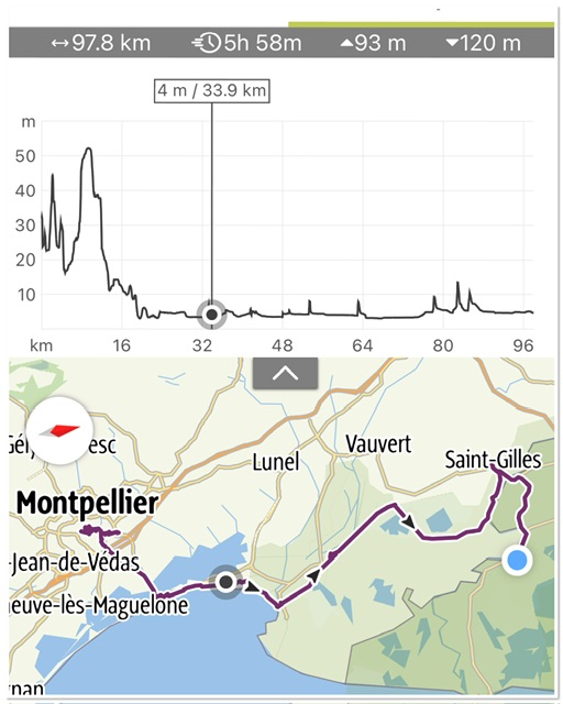 DAY 7/6th day biking (Montpellier-Camargue, EV17/EV8): 98km, +100m gain