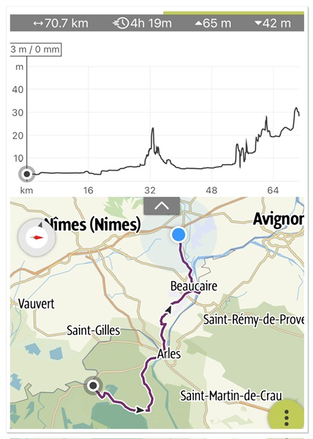 DAY 8/7th day biking (Camargue to ARLES to Beaucaire /Tarascon to Meynes, EV17/EV8): 70km, +65m gain