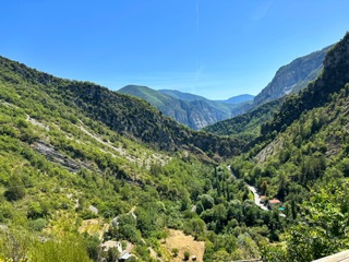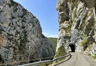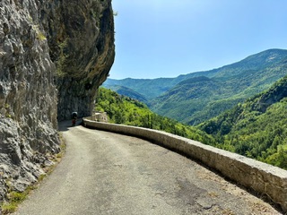 And again, just before Aiglun, another stunning landscape opens before us: vertical rocky walls split by the passing stream (L’Esteron) and its Canyon d’Aiglun; many little stony ponds at the bottom of the Canyon for a refreshing bath; and yet another balcony road cut into the rock for a very scenic ride.