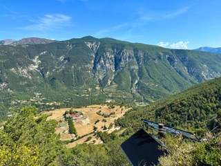 Crossing onto a parallel ridge, we continue with striking views of the valley and of the rocky mountainside, passing the little hamlet of Le Mas (yes, there is a coffee shop if needed).
