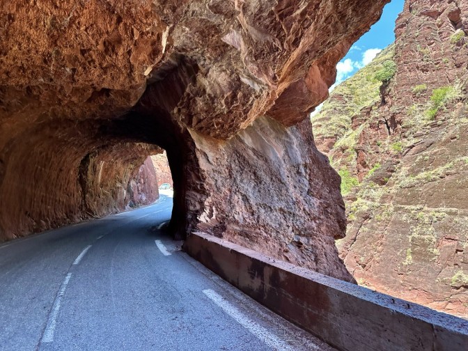 The road is cut into the red mountains with several small tunnels and overhanging slabs.