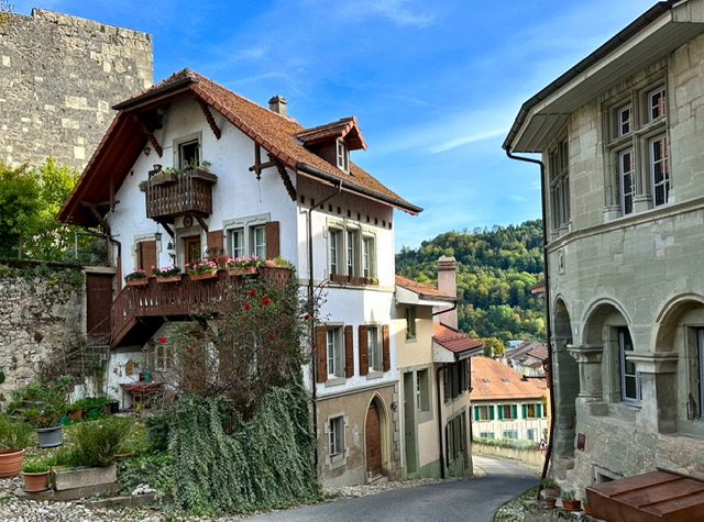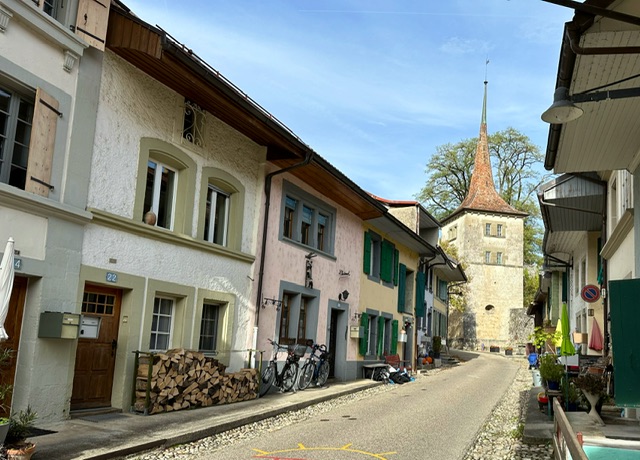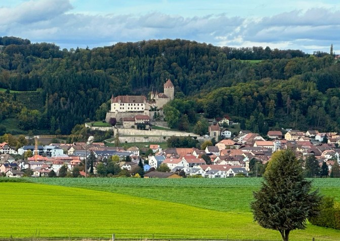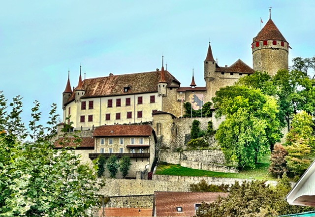 A long descent brings me to Lucens, another medieval town at the bottom of the valley along the river Broye. Here I’m drawn to the spectacular perched castle that once belonged to Adrian Conan Doyle, son of Sir Arthur Conan Doyle (yes, the village has its very own Sherlock Holmes museum).