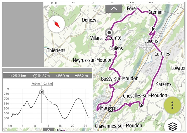 Stats from Schweizmobil: Moudon (510m)-Villars.le.Comte (765m)-Lucens (500m)-Moudon: 24km long, +600m gain. (https://schweizmobil.ch/en/cycling-in-switzerland/route-472).