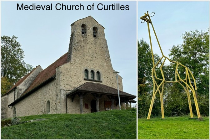 Leaving Lucens, the road passes next to an eye catching 1000 years old Romanesque church (Church of Curtilles) , frequented in the past by pilgrims walking the St. James’s Way/ Via Jacobi (one of ways to Santiago de Compostela).