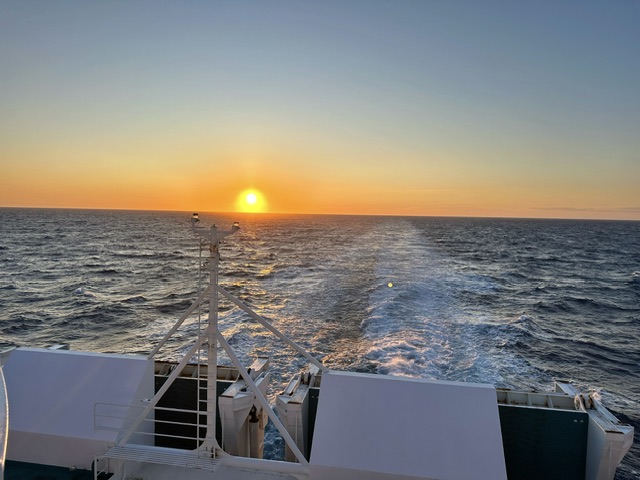 People hang on decks during the day, try to get an early sunburn even before reaching the sunny beaches LOL. But I don’t like the humid sticky feeling of sea breeze on my skin, so I tend to look at the panorama from the large window panes of indoor lounges. After a couple of hours the Italian coast disappears and then we are in the middle of the Sea, lulling on the Mediterranean weaves. As the evening approaches, the clear sky offers a fantastic view of the sunset and we come out to the chilly deck covered by sweaters.