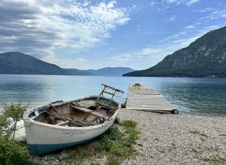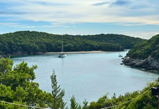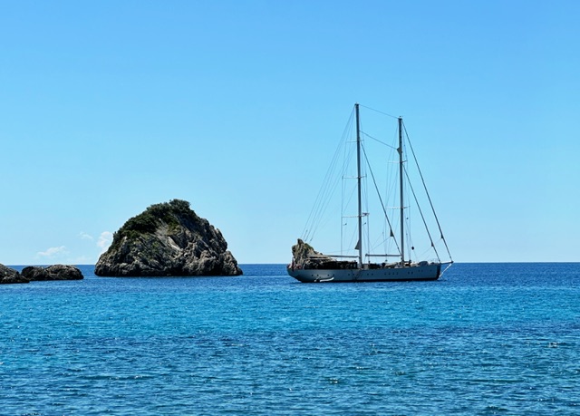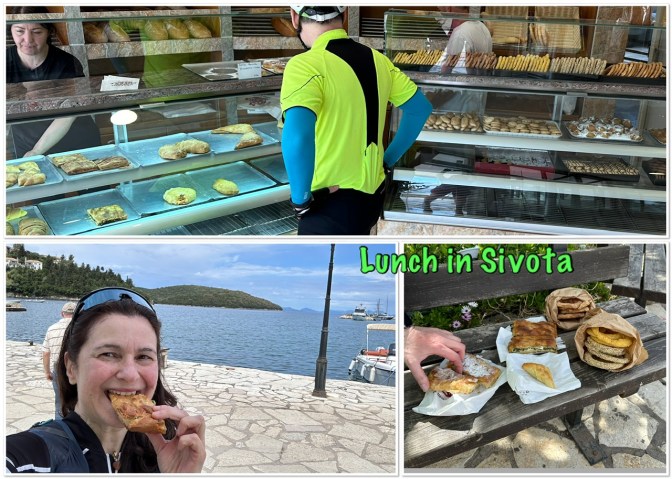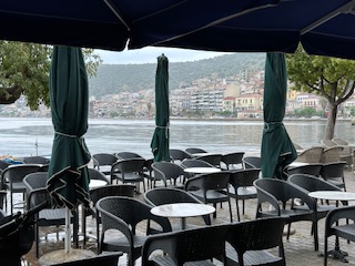 We linger here for a couple of hours, skipping the sunniest period. We still have 1/2 way to go so we avoid swimming though the waters are very enticing. Instead we seat in a seafront Taverna for some salad, feta, and coffee.