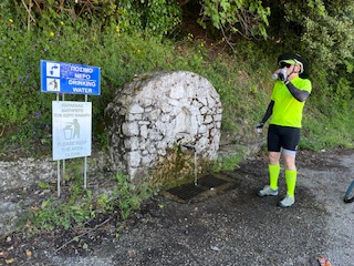 As we leave the coast, the land becomes completely unspoiled, with only olive cultivars as a sign of civilization. Thus, we are quite surprised when we find on this road a real fountain clearly marked as “drinkable water”.