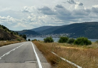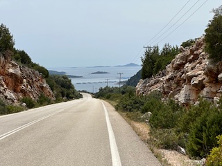 We encounter very few cars on this road (off season). We indeed deviated from the Eurovelo-8 and took the more scenic coastal road towards Sivota, our night destination.