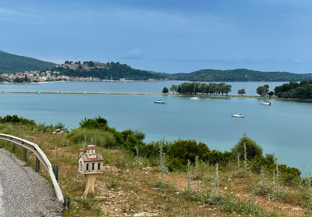 Finally, the rain subsides and we are back on the saddle. The second half of this section cuts inland so that we skip the peninsula overlooking the island of Lefkada.