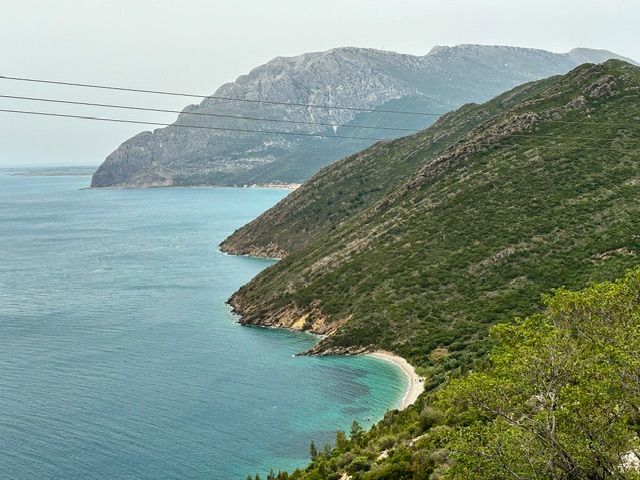 Leaving Parga, the road climbs again gently for about 200m. The wind has picked up but thankfully we can just crank up a little the engine. Another impressive beach along this road is Lichnos, but it is far below the road and that it would require some serious effort to get there and back.