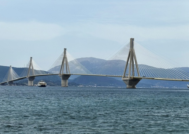 With the last long descent we finally reach the famous Rio-Antirrio Bridge, that, with its almost 3km length, is considered one of the longest cable-stayed bridges in the world.