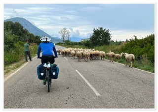 Finally we rejoin the official Eurovelo-8 planned route, though there are no bike paths and not even EV signs (under development). And the traffic picks up considerably as we merge with the national road; trucks and cars pass us at high-speed, but the road is large and we don’t feel threatened.