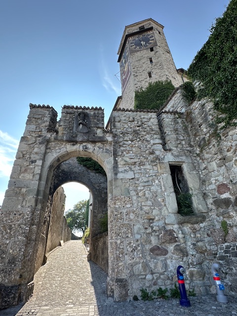 Arrived in Wattil, with surprise I spot an ancient Tower on the surrounding hills (not mentioned on the SwitzerlandMobility website). I open the Google map, and indeed I found this unknown, but well preserved Burg Iberg (13th century, rebuilt in 1902) purposely situated along the Jacob Way. It is open 10am-7pm, April-Oct and has free access . But I soon discover why it is not on the tourist list: there is no road to reach its entrance, just a single track steep natural path. Though short, it allows only pedestrian traffic. And so, not to leave all my belongings in the parking below, I haul my heavy bike up the hill and run up the Tower for a quick peek. The tower is completely bare inside but it is very well preserved and one can walk all the way to the top to enjoy an amazing 360 panorama.