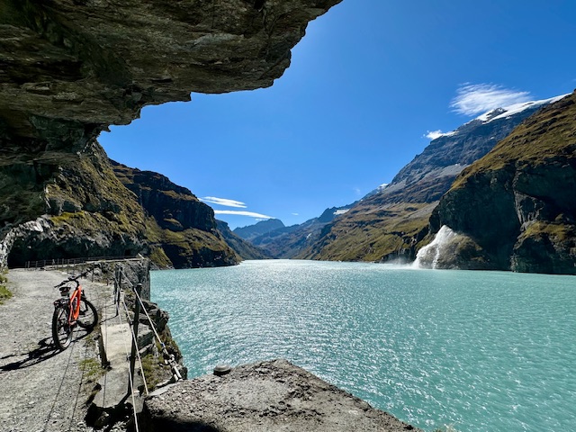 The Dam is 250m high, the 15th highest in the world, and forms the Lac de Mauvoisin. This Lac is really stunning, flanked by tall rocky mountains, among which is the massif of the Grand Combin with some of the highest peaks in the Alps (in the 4,000m). A few glaciers can be spotted in the distance.